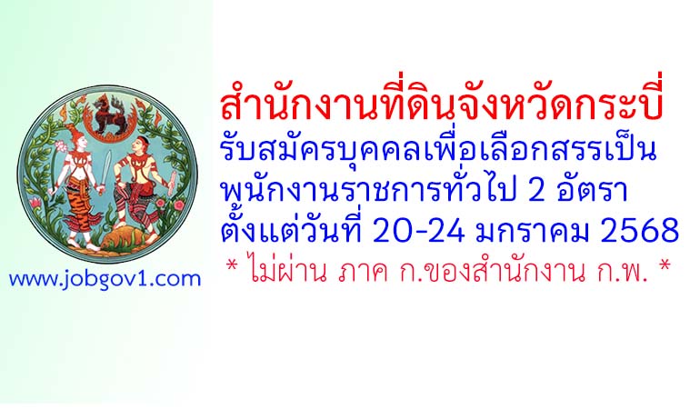สำนักงานที่ดินจังหวัดกระบี่ รับสมัครบุคคลเพื่อเลือกสรรเป็นพนักงานราชการทั่วไป 2 อัตรา ตั้งแต่วันที่ 20-24 มกราคม 2568