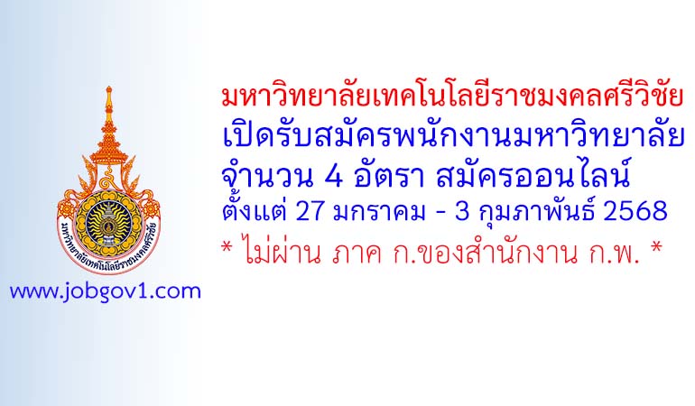 ประกาศมหาวิทยาลัยเทคโนโลยีราชมงคลศรีวิชัย เรื่อง รับสมัครบุคคลเพื่อสรรหาและเลือกสรรเป็นพนักงานมหาวิทยาลัย สังกัดมหาวิทยาลัยเทคโนโลยีราชมงคลศรีวิชัย (ตำแหน่งประเภทวิชาชีพเฉพาะหรือเชี่ยวชาญเฉพาะ) โดยวิธีการสอบแข่งขัน ครั้งที่ 1/2568