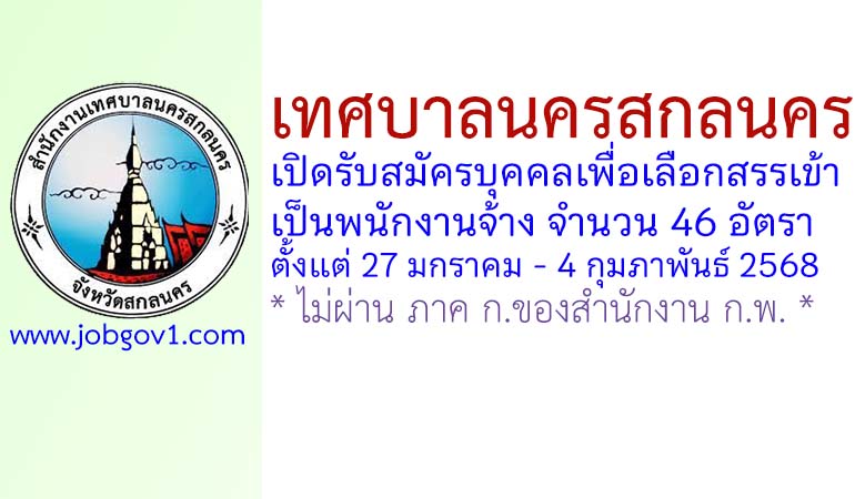 เทศบาลนครสกลนคร รับสมัครบุคคลเพื่อเลือกสรรเข้าเป็นพนักงานจ้าง 46 อัตรา ตั้งแต่ 27 มกราคม – 4 กุมภาพันธ์ 2568