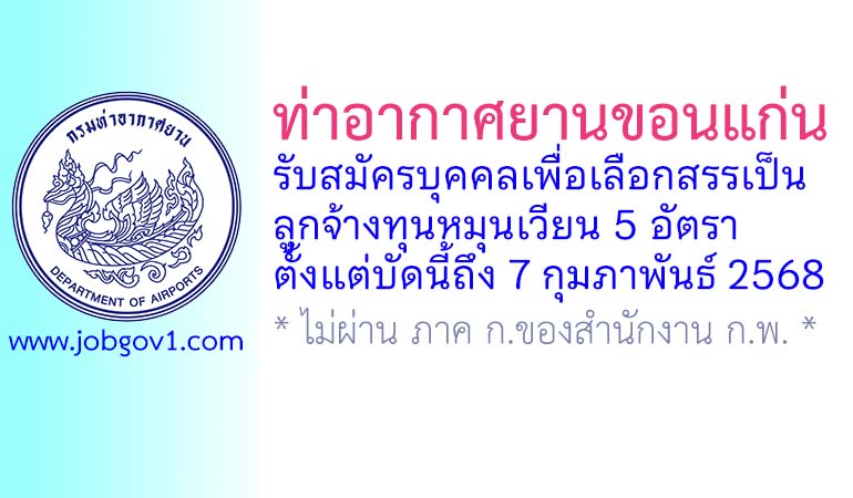 ท่าอากาศยานขอนแก่น รับสมัครบุคคลเพื่อเลือกสรรเป็นลูกจ้างทุนหมุนเวียน 5 อัตรา ตั้งแต่บัดนี้ถึง 7 กุมภาพันธ์ 2568