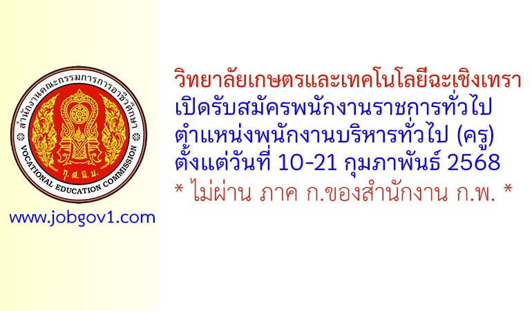 วิทยาลัยเกษตรและเทคโนโลยีฉะเชิงเทรา รับสมัครพนักงานราชการทั่วไป ตำแหน่งพนักงานบริหารทั่วไป (ครู) ตั้งแต่วันที่ 10-21 กุมภาพันธ์ 2568