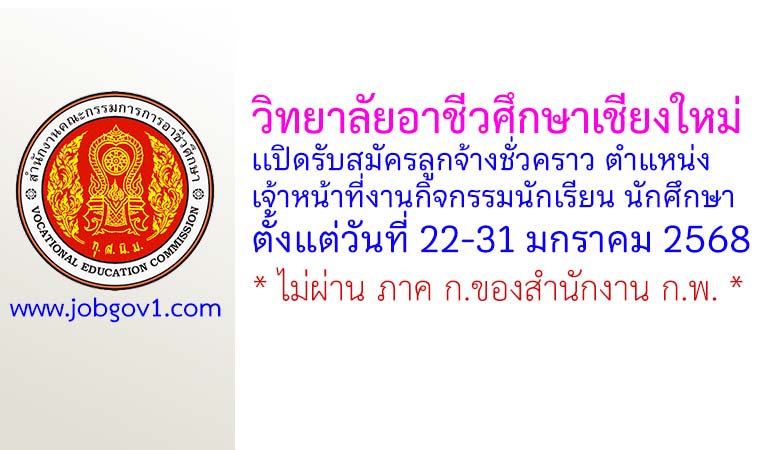วิทยาลัยอาชีวศึกษาเชียงใหม่ รับสมัครลูกจ้างชั่วคราว ตำแหน่งเจ้าหน้าที่งานกิจกรรมนักเรียน นักศึกษา ตั้งแต่วันที่ 22-31 มกราคม 2568
