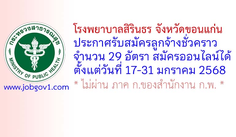 โรงพยาบาลสิรินธร จังหวัดขอนแก่น รับสมัครลูกจ้างชั่วคราว 29 อัตรา ตั้งแต่วันที่ 17-31 มกราคม 2568