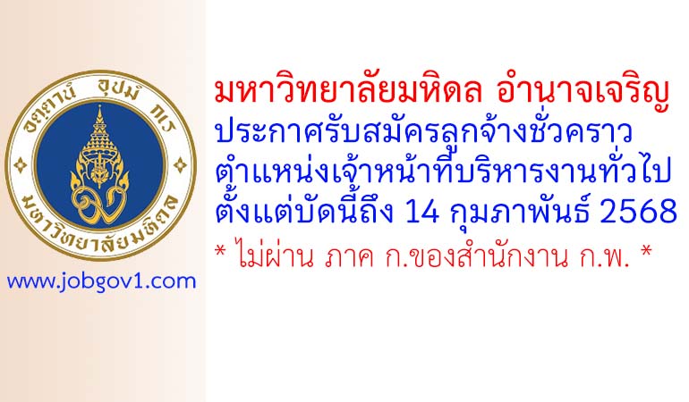 มหาวิทยาลัยมหิดล อำนาจเจริญ รับสมัครลูกจ้างชั่วคราว ตำแหน่งเจ้าหน้าที่บริหารงานทั่วไป ตั้งแต่บัดนี้ถึง 14 กุมภาพันธ์ 2568