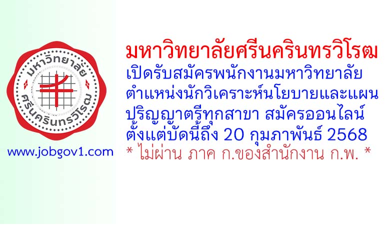 มหาวิทยาลัยศรีนครินทรวิโรฒ รับสมัครพนักงานมหาวิทยาลัย ตำแหน่งนักวิเคราะห์นโยบายและแผน ตั้งแต่บัดนี้ถึง 20 กุมภาพันธ์ 2568