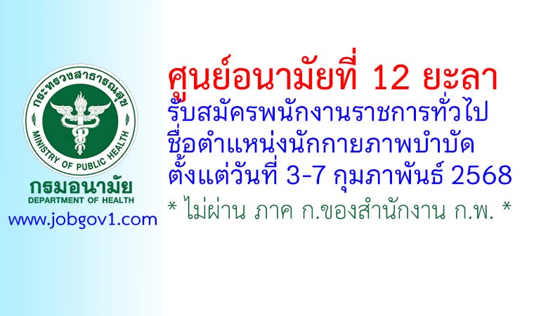 ประกาศศูนย์อนามัยที่ 12 ยะลา เรื่อง รับสมัครบุคคลเพื่อเลือกสรรเป็นพนักงานราชการทั่วไป ตำแหน่งนักกายภาพบำบัด