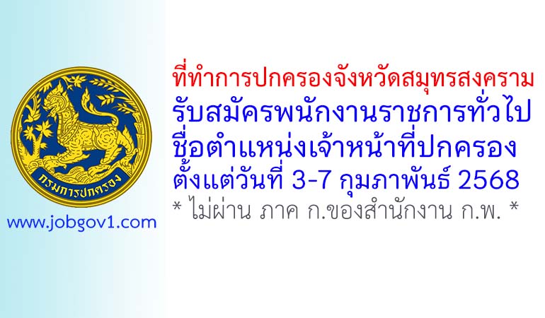 ที่ทำการปกครองจังหวัดสมุทรสงคราม รับสมัครพนักงานราชการทั่วไป ตำแหน่งเจ้าหน้าที่ปกครอง ตั้งแต่วันที่ 3-7 กุมภาพันธ์ 2568
