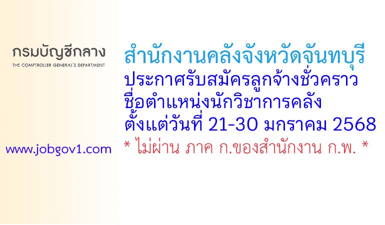 สำนักงานคลังจังหวัดจันทบุรี รับสมัครลูกจ้างชั่วคราว ตำแหน่งนักวิชาการคลัง ตั้งแต่วันที่ 21-30 มกราคม 2568