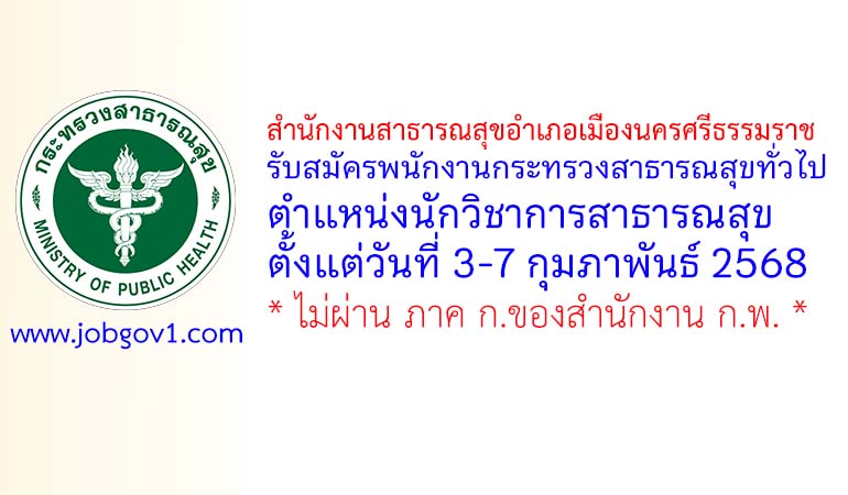 สำนักงานสาธารณสุขอำเภอเมืองนครศรีธรรมราช รับสมัครพนักงานกระทรวงสาธารณสุขทั่วไป ตำแหน่งนักวิชาการสาธารณสุข ตั้งแต่วันที่ 3-7 กุมภาพันธ์ 2568
