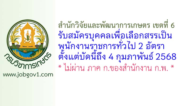 สำนักวิจัยและพัฒนาการเกษตร เขตที่ 6 รับสมัครบุคคลเพื่อเลือกสรรเป็นพนักงานราชการทั่วไป 2 อัตรา ตั้งแต่บัดนี้ถึง 4 กุมภาพันธ์ 2568
