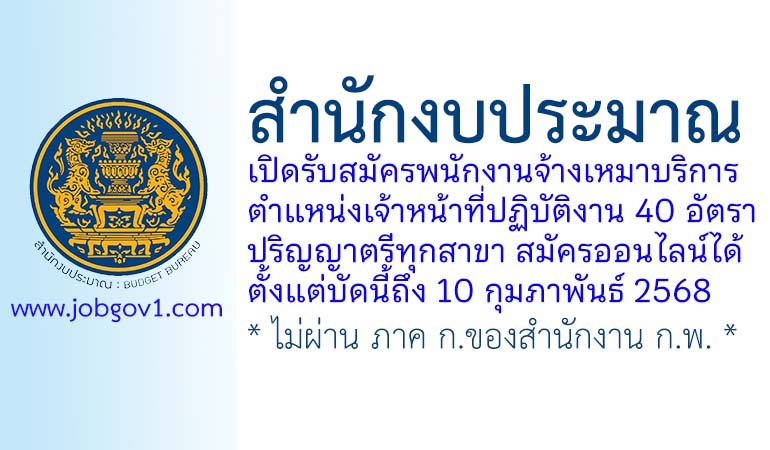 สำนักงบประมาณ รับสมัครพนักงานจ้างเหมาบริการ ตำแหน่งเจ้าหน้าที่ปฏิบัติงาน 40 อัตรา ตั้งแต่บัดนี้ถึง 10 กุมภาพันธ์ 2568