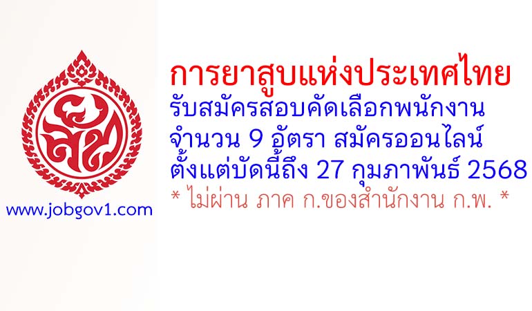 การยาสูบแห่งประเทศไทย รับสมัครสอบคัดเลือกพนักงาน 9 อัตรา ตั้งแต่บัดนี้ถึง 27 กุมภาพันธ์ 2568