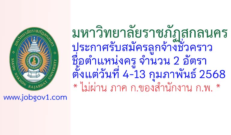มหาวิทยาลัยราชภัฏสกลนคร รับสมัครลูกจ้างชั่วคราว ตำแหน่งครู จำนวน 2 อัตรา ตั้งแต่วันที่ 4-13 กุมภาพันธ์ 2568