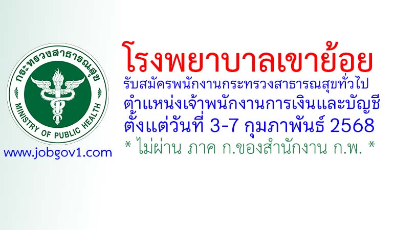 โรงพยาบาลเขาย้อย รับสมัครพนักงานกระทรวงสาธารณสุขทั่วไป ตำแหน่งเจ้าพนักงานการเงินและบัญชี ตั้งแต่วันที่ 3-7 กุมภาพันธ์ 2568