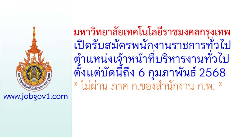 มหาวิทยาลัยเทคโนโลยีราชมงคลกรุงเทพ รับสมัครพนักงานราชการทั่วไป ตำแหน่งเจ้าหน้าที่บริหารงานทั่วไป ตั้งแต่บัดนี้ถึง 6 กุมภาพันธ์ 2568