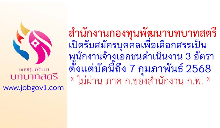 สำนักงานกองทุนพัฒนาบทบาทสตรี รับสมัครบุคคลเพื่อเลือกสรรเป็นพนักงานจ้างเอกชนดำเนินงาน 3 อัตรา ตั้งแต่บัดนี้ถึง 7 กุมภาพันธ์ 2568