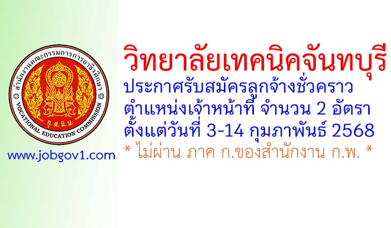 วิทยาลัยเทคนิคจันทบุรี รับสมัครลูกจ้างชั่วคราว ตำแหน่งเจ้าหน้าที่ 2 อัตรา ตั้งแต่วันที่ 3-14 กุมภาพันธ์ 2568