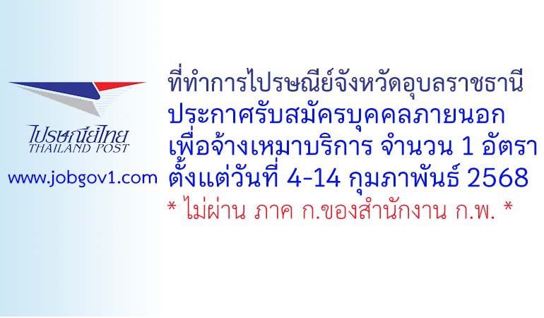 ที่ทำการไปรษณีย์จังหวัดอุบลราชธานี รับสมัครบุคคลภายนอกเพื่อจ้างเหมาบริการ 1 อัตรา ตั้งแต่วันที่ 4-14 กุมภาพันธ์ 2568