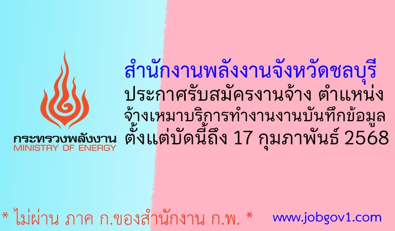 สำนักงานพลังงานจังหวัดชลบุรี รับสมัครพนักงานจ้างเหมาบริการ ตำแหน่งจ้างเหมาบริการทำงานงานบันทึกข้อมูล ตั้งแต่บัดนี้ถึง 17 กุมภาพันธ์ 2568