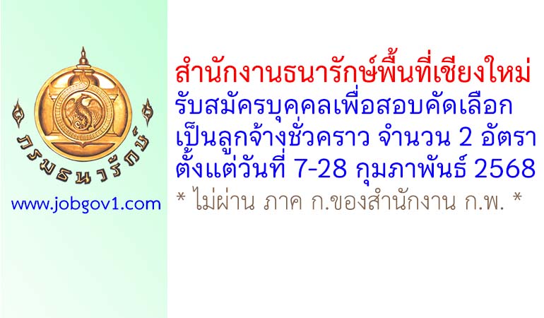 สำนักงานธนารักษ์พื้นที่เชียงใหม่ รับสมัครลูกจ้างชั่วคราว จำนวน 2 อัตรา ตั้งแต่วันที่ 7-28 กุมภาพันธ์ 2568