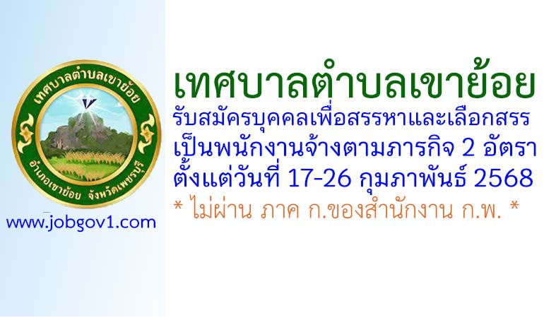 เทศบาลตำบลเขาย้อย รับสมัครบุคคลเพื่อสรรหาและเลือกสรรเป็นพนักงานจ้างตามภารกิจ 2 อัตรา ตั้งแต่วันที่ 17-26 กุมภาพันธ์ 2568