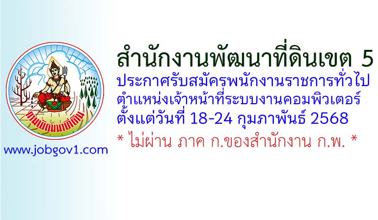 สำนักงานพัฒนาที่ดินเขต 5 รับสมัครพนักงานราชการทั่วไป ตำแหน่งเจ้าหน้าที่ระบบงานคอมพิวเตอร์ ตั้งแต่วันที่ 18-24 กุมภาพันธ์ 2568