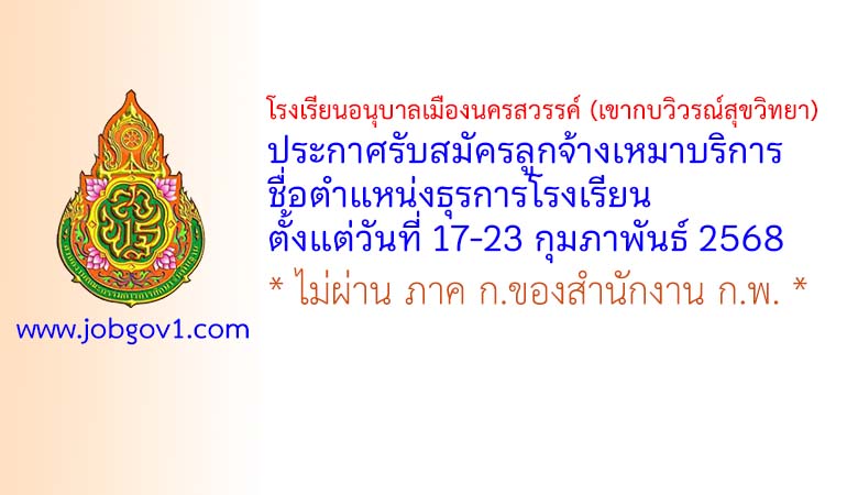 โรงเรียนอนุบาลเมืองนครสวรรค์ (เขากบวิวรณ์สุขวิทยา) รับสมัครลูกจ้างเหมาบริการ ตำแหน่งธุรการโรงเรียน ตั้งแต่วันที่ 17-23 กุมภาพันธ์ 2568