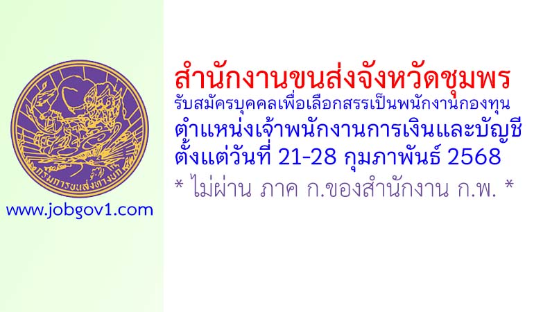 สำนักงานขนส่งจังหวัดชุมพร รับสมัครบุคคลเพื่อเลือกสรรเป็นพนักงานกองทุน ตำแหน่งเจ้าพนักงานการเงินและบัญชี ตั้งแต่วันที่ 21-28 กุมภาพันธ์ 2568