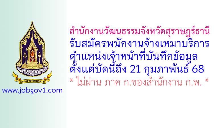 สำนักงานวัฒนธรรมจังหวัดสุราษฎร์ธานี รับสมัครพนักงานจ้างเหมาบริการ ตำแหน่งเจ้าหน้าที่บันทึกข้อมูล ตั้งแต่บัดนี้ถึง 21 กุมภาพันธ์ 2568
