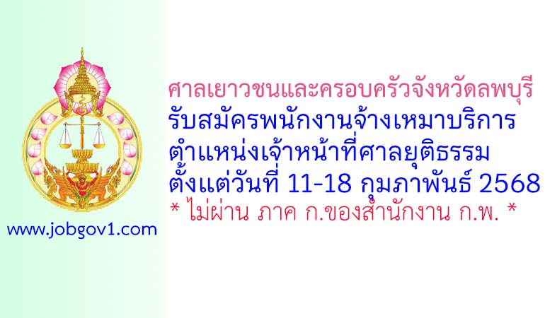 ศาลเยาวชนและครอบครัวจังหวัดลพบุรี รับสมัครพนักงานจ้างเหมาบริการ ตำแหน่งเจ้าหน้าที่ศาลยุติธรรม ตั้งแต่วันที่ 11-18 กุมภาพันธ์ 2568