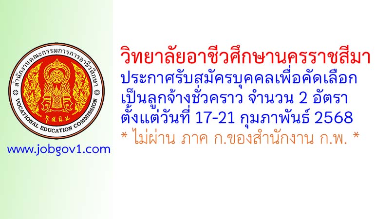 วิทยาลัยอาชีวศึกษานครราชสีมา รับสมัครบุคคลเพื่อคัดเลือกเป็นลูกจ้างชั่วคราว 2 อัตรา ตั้งแต่วันที่ 17-21 กุมภาพันธ์ 2568