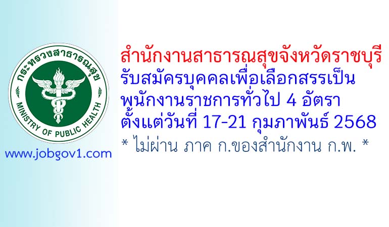 สำนักงานสาธารณสุขจังหวัดราชบุรี รับสมัครบุคคลเพื่อเลือกสรรเป็นพนักงานราชการทั่วไป 4 อัตรา ตั้งแต่วันที่ 17-21 กุมภาพันธ์ 2568