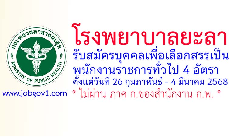 โรงพยาบาลยะลา รับสมัครบุคคลเพื่อเลือกสรรเป็นพนักงานราชการทั่วไป 4 อัตรา ตั้งแต่วันที่ 26 กุมภาพันธ์ – 4 มีนาคม 2568