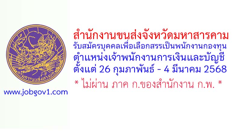 สำนักงานขนส่งจังหวัดมหาสารคาม รับสมัครบุคคลเพื่อเลือกสรรเป็นพนักงานกองทุน ตำแหน่งเจ้าพนักงานการเงินและบัญชี ตั้งแต่ 26 กุมภาพันธ์ – 4 มีนาคม 2568
