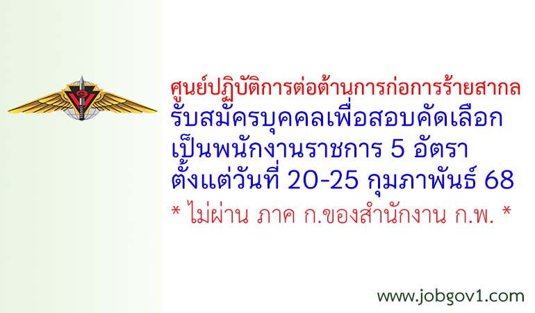 ศูนย์ปฏิบัติการต่อต้านการก่อการร้ายสากล รับสมัครบุคคลเพื่อสอบคัดเลือกเป็นพนักงานราชการ 5 อัตรา ตั้งแต่วันที่ 20-25 กุมภาพันธ์ 2568