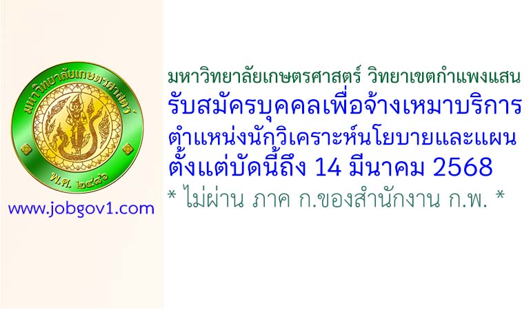 มหาวิทยาลัยเกษตรศาสตร์ วิทยาเขตกำแพงแสน รับสมัครบุคคลเพื่อจ้างเหมาบริการ ตำแหน่งนักวิเคราะห์นโยบายและแผน ตั้งแต่บัดนี้ถึง 14 มีนาคม 2568