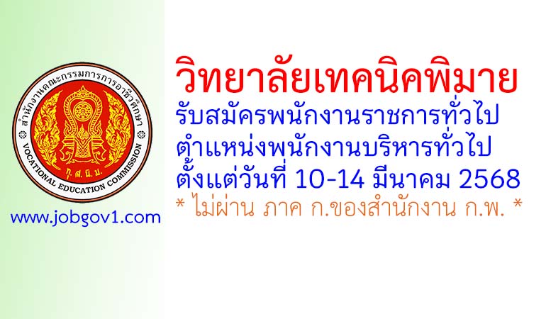 วิทยาลัยเทคนิคพิมาย รับสมัครพนักงานราชการทั่วไป ตำแหน่งพนักงานบริหารทั่วไป (ครู) ตั้งแต่วันที่ 10-14 มีนาคม 2568