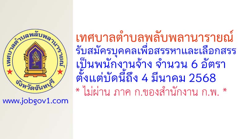 เทศบาลตำบลพลับพลานารายณ์ รับสมัครบุคคลเพื่อสรรหาและเลือกสรรเป็นพนักงานจ้าง 6 อัตรา ตั้งแต่บัดนี้ถึง 4 มีนาคม 2568