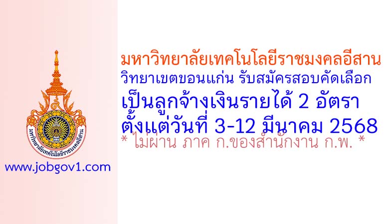 มหาวิทยาลัยเทคโนโลยีราชมงคลอีสาน วิทยาเขตขอนแก่น รับสมัครสอบคัดเลือกเป็นลูกจ้างเงินรายได้ 2 อัตรา ตั้งแต่วันที่ 3-12 มีนาคม 2568