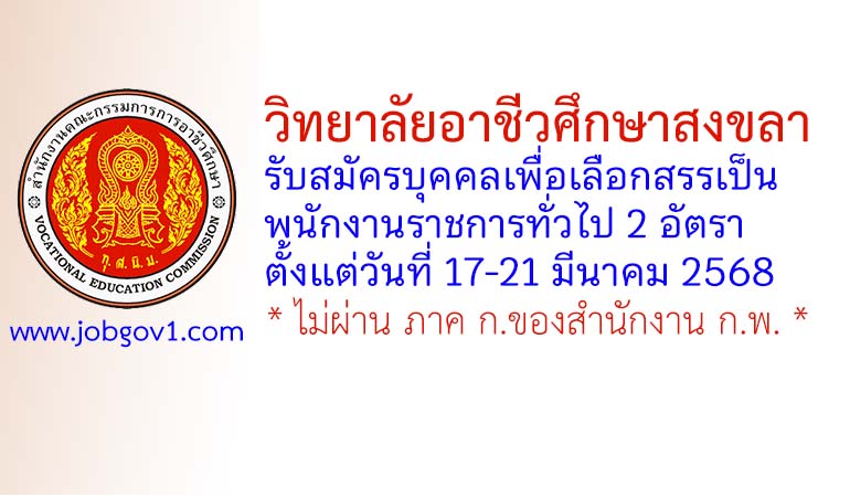 วิทยาลัยอาชีวศึกษาสงขลา รับสมัครบุคคลเพื่อเลือกสรรเป็นพนักงานราชการทั่วไป 2 อัตรา ตั้งแต่วันที่ 17-21 มีนาคม 2568