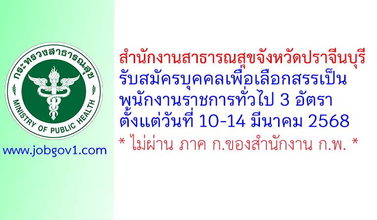สำนักงานสาธารณสุขจังหวัดปราจีนบุรี รับสมัครบุคคลเพื่อเลือกสรรเป็นพนักงานราชการทั่วไป 3 อัตรา ตั้งแต่วันที่ 10-14 มีนาคม 2568