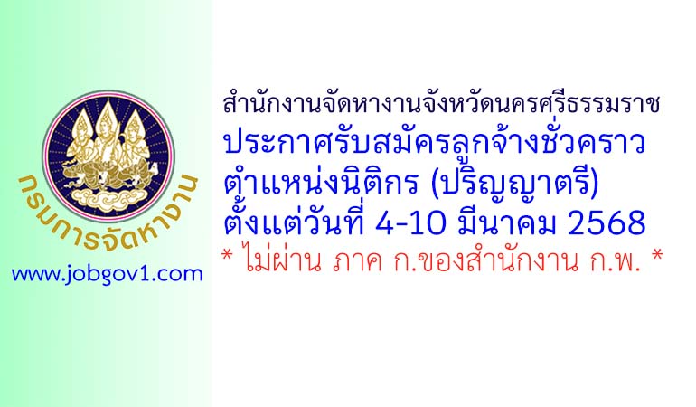สำนักงานจัดหางานจังหวัดนครศรีธรรมราช รับสมัครลูกจ้างชั่วคราว ตำแหน่งนิติกร(ปริญญาตรี) ตั้งแต่วันที่ 4-10 มีนาคม 2568