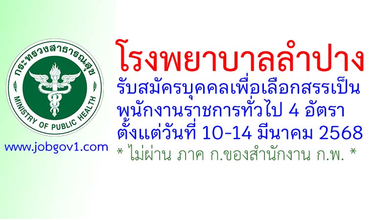 โรงพยาบาลลำปาง รับสมัครบุคคลเพื่อเลือกสรรเป็นพนักงานราชการทั่วไป 4 อัตรา ตั้งแต่วันที่ 10-14 มีนาคม 2568