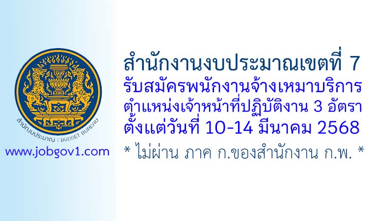 สำนักงานงบประมาณเขตที่ 7 รับสมัครพนักงานจ้างเหมาบริการ ตำแหน่งเจ้าหน้าที่ปฏิบัติงาน 3 อัตรา ตั้งแต่วันที่ 10-14 มีนาคม 2568