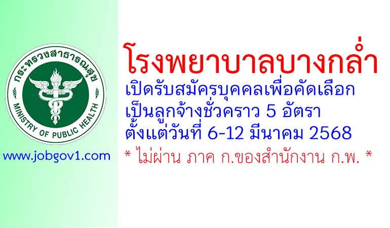 โรงพยาบาลบางกล่ำ รับสมัครบุคคลเพื่อคัดเลือกเป็นลูกจ้างชั่วคราว 5 อัตรา ตั้งแต่วันที่ 6-12 มีนาคม 2568