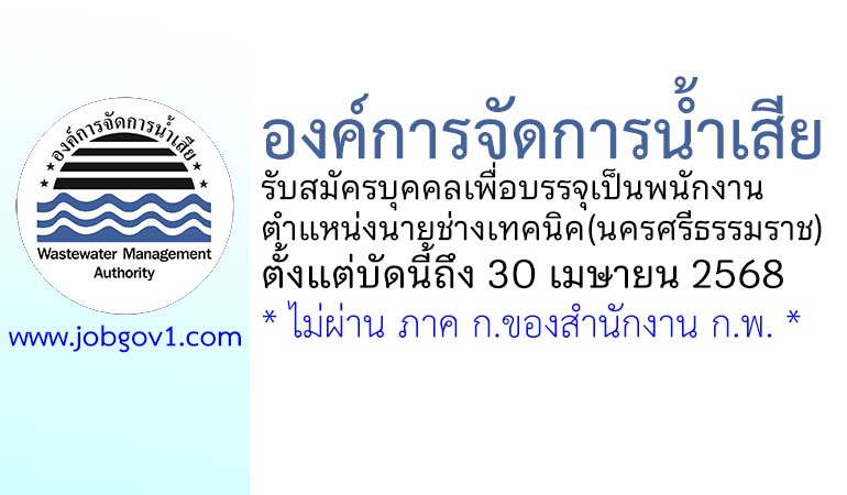 องค์การจัดการน้ำเสีย รับสมัครบุคคลเพื่อบรรจุเป็นพนักงาน ตำแหน่งนายช่างเทคนิค(นครศรีธรรมราช) ตั้งแต่บัดนี้ถึง 30 เมษายน 2568