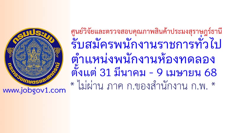 ศูนย์วิจัยและตรวจสอบคุณภาพสินค้าประมงสุราษฎร์ธานี รับสมัครพนักงานราชการทั่วไป ตำแหน่งพนักงานห้องทดลอง ตั้งแต่ 31 มีนาคม – 9 เมษายน 2568
