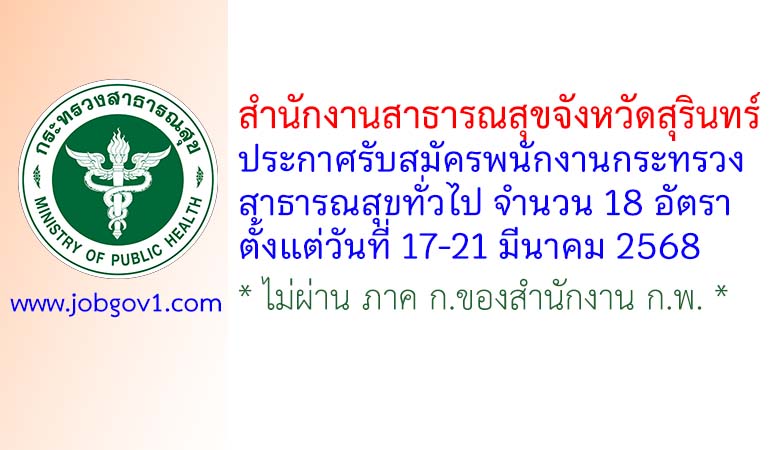 สำนักงานสาธารณสุขจังหวัดสุรินทร์ รับสมัครพนักงานกระทรวงสาธารณสุขทั่วไป 18 อัตรา ตั้งแต่วันที่ 17-21 มีนาคม 2568