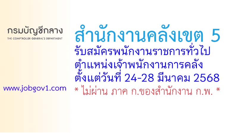 สำนักงานคลังเขต 5 รับสมัครพนักงานราชการทั่วไป ตำแหน่งเจ้าพนักงานการคลัง ตั้งแต่วันที่ 24-28 มีนาคม 2568