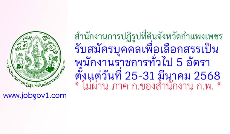 สำนักงานการปฏิรูปที่ดินจังหวัดกำแพงเพชร รับสมัครบุคคลเพื่อเลือกสรรเป็นพนักงานราชการทั่วไป 5 อัตรา ตั้งแต่วันที่ 25-31 มีนาคม 2568